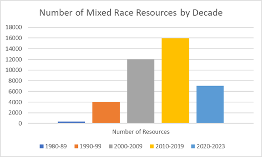 The lack of an overall welcoming campus climate for many people of color is a daily reality for many mixed race students, faculty, and staff in a world that revolves around mono-racial norms. The study of what it means to be multiracial in a mono-racially organized world is called “critical mixed race studies” (CMRS). Academic librarians should know that both the numbers of mixed-race students and those engaging in CMRS research are growing rapidly throughout the disciplines. A recent search in ProQuest Research Library on the terms “mixed-race OR biracial OR multiracial” returned 359 results in the decade beginning in 1980, and 16,242 results in the decade beginning in 2010! (See Figure 1 for details.)
