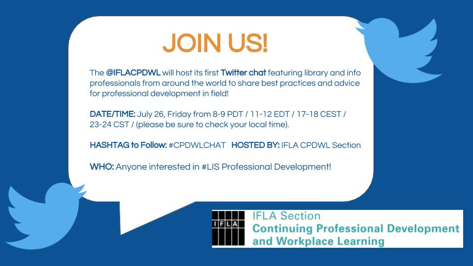 We will be using the hashtag #CPDWLChat for this conversation and the Twitter handle @IFLACPDWL will moderate the discussion. All interested folks can participate in this online forum with their Twitter accounts and respond to our questions too using #CPDWLChat.