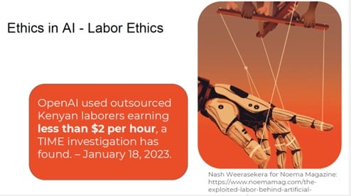 Figure 1. Presentation slide from Dr. Jessica BrodeFrank on AI labor ethics, focusing on outsourced labor and wage disparities in the AI industry.